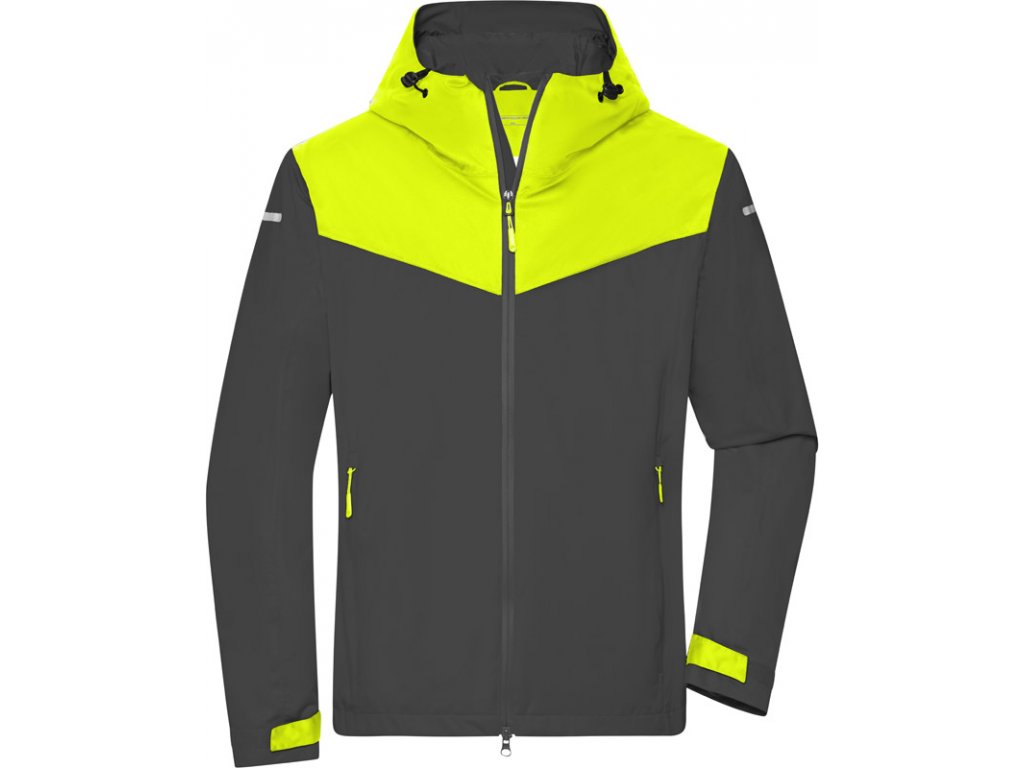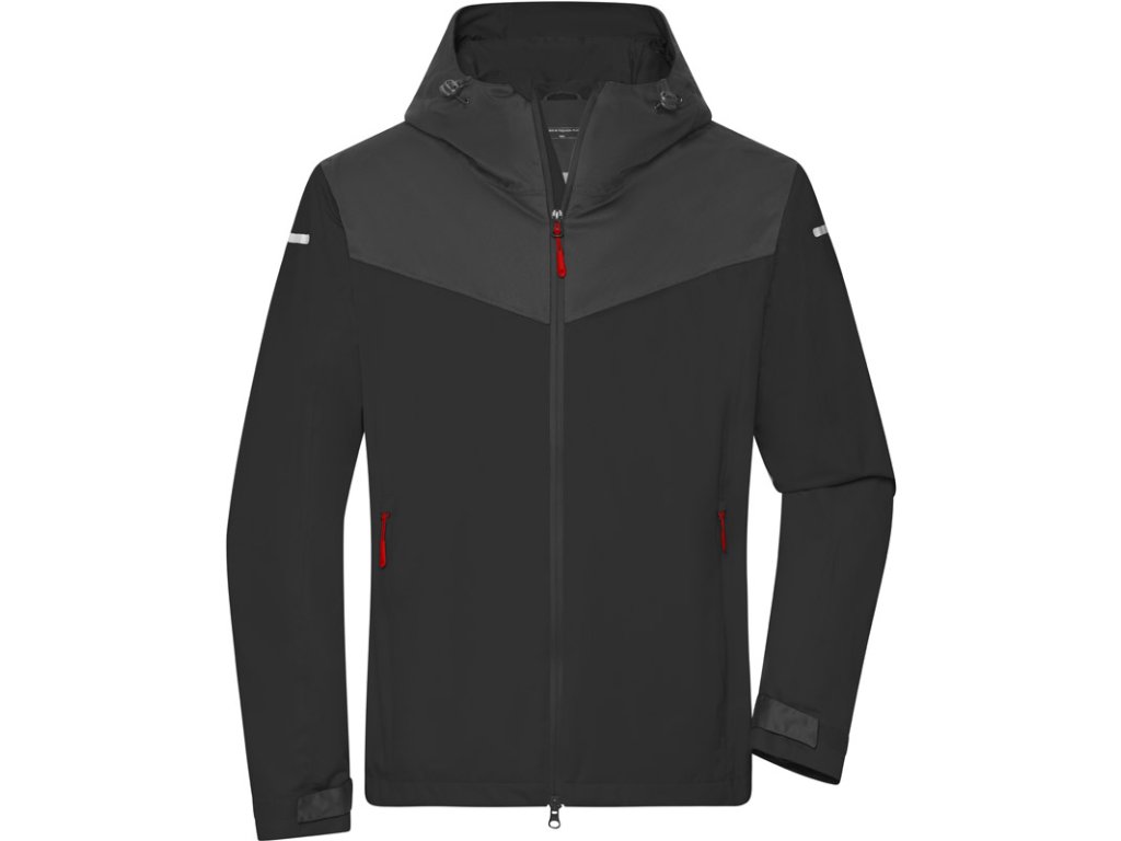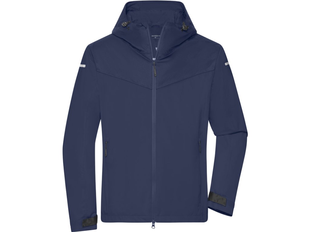 Vetruodolná a vodeodolná (10.000mm vodný stĺpec), vodotesné zipsy, priedušná a priepustná pre vodné páry (5.000g/m² za 24h), nastaviteľná kapucňa, regulácia šírky na manžetách pomocou suchého zipsu, YKK zipsy, plný skrytý 2-cestný zips s ochranou brady, 1 vnútrné vrecko, 2 bočné vrecká so zipsom, zapečatené švy, ergonomicky predĺužená zadná časť, ľahká sieťovaná podšívka, reflexné detaily na rukávoch a chrbte