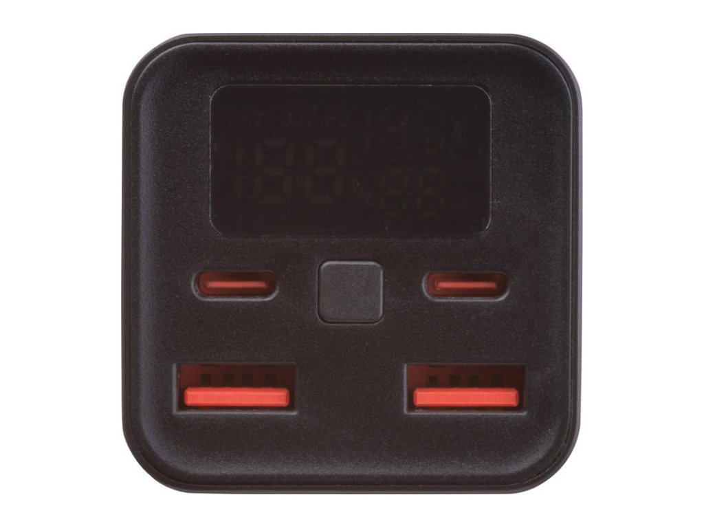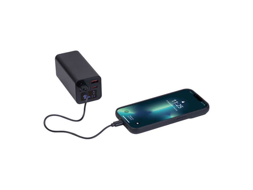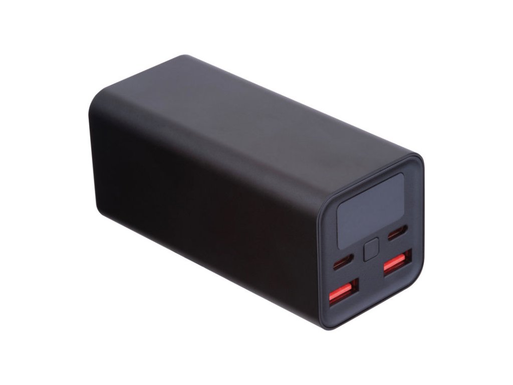 Powerbank s kapacitou 20 000 mAh a celkovým výkonom 70 W. LCD displej a mäkký gumový povrch. Obsahuje kábel (USB na USB-C)