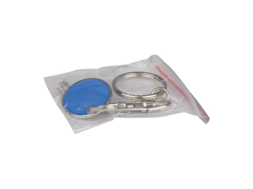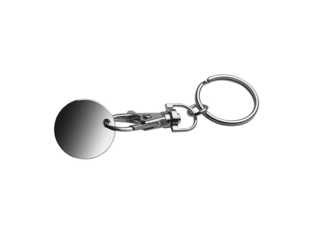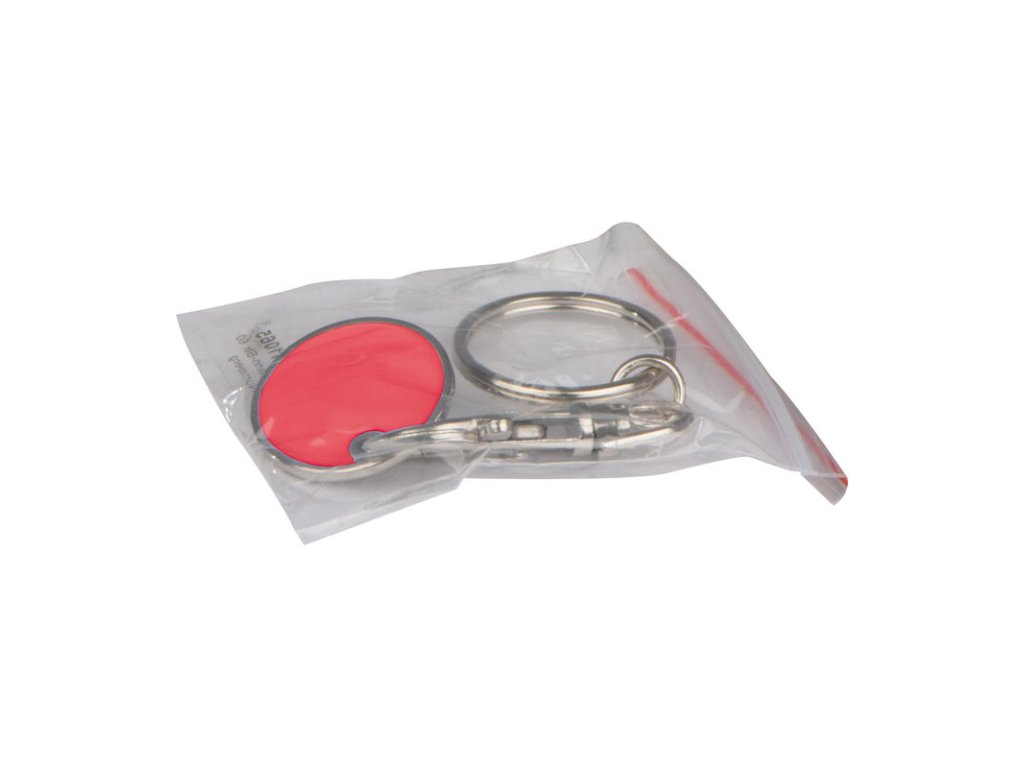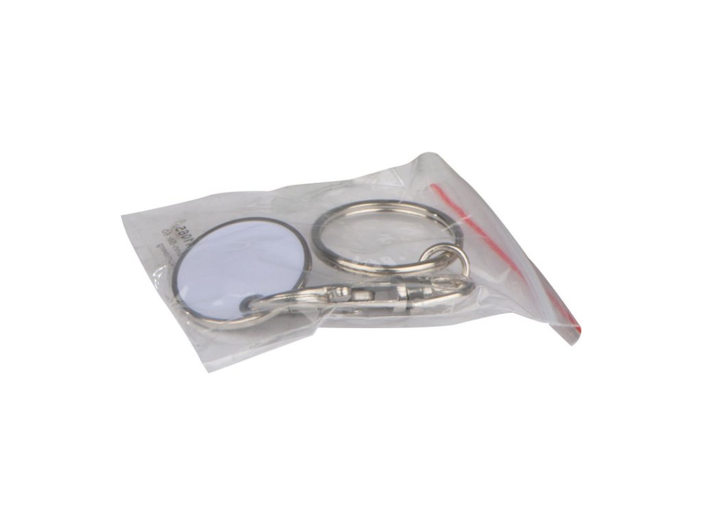 Kľúčenka s karabínkou a s odnímateľným žetónom na nákupné vozíky. Mince sú z jednej strany ploché a ponúkajú ideálne miesto pre Vaše logo.