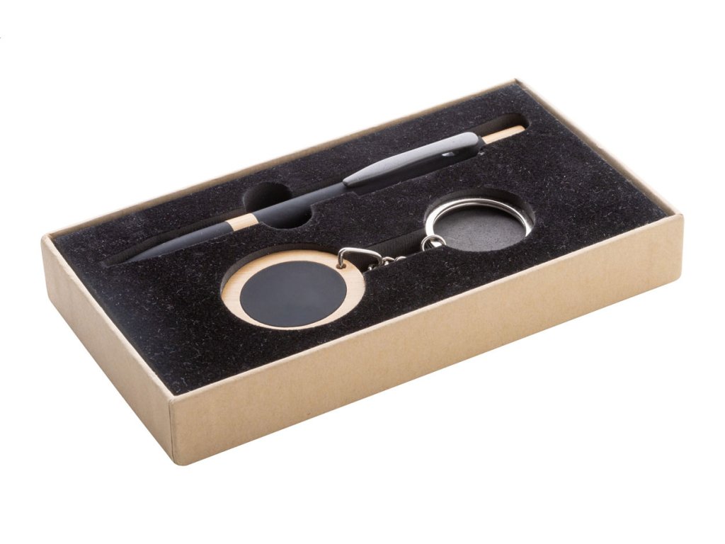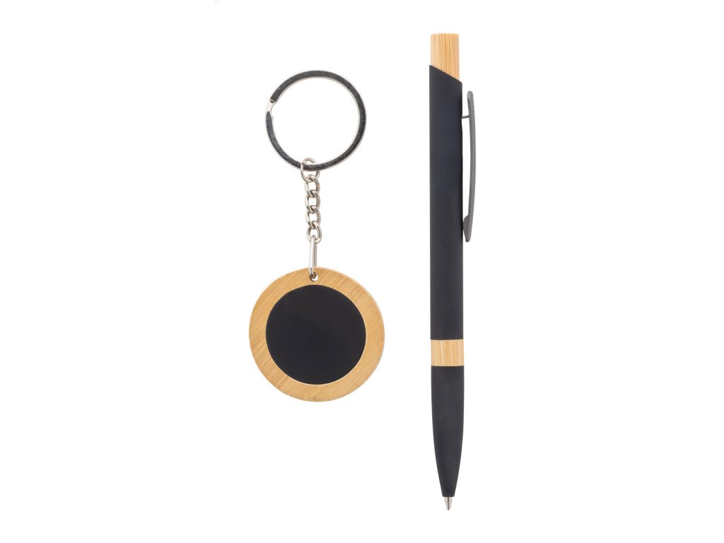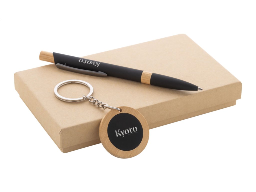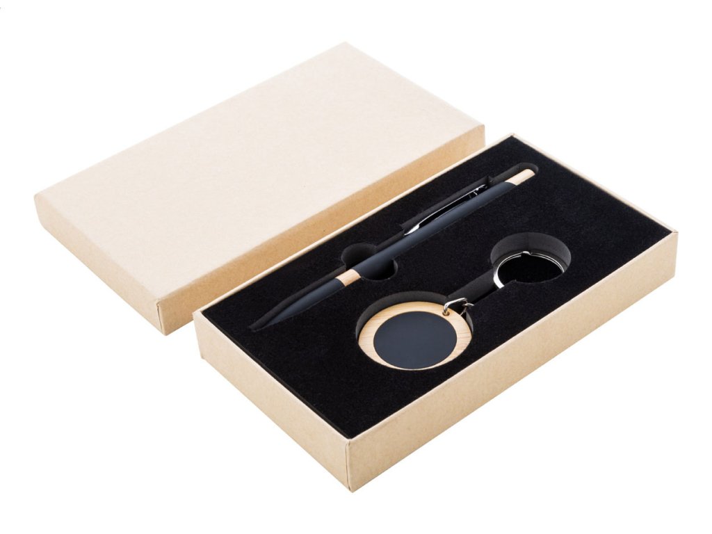 Vrátane guľôčkového pera z recyklovaného hliníka s bambusovými detailmi, pogumovaným povrchom a modrou náplňou a bambusového krúžku na kľúče s pogumovaným povrchom z recyklovanej nerezovej ocele. Obe položky majú špeciálnu povrchovú úpravu na zrkadlové laserové gravírovanie.