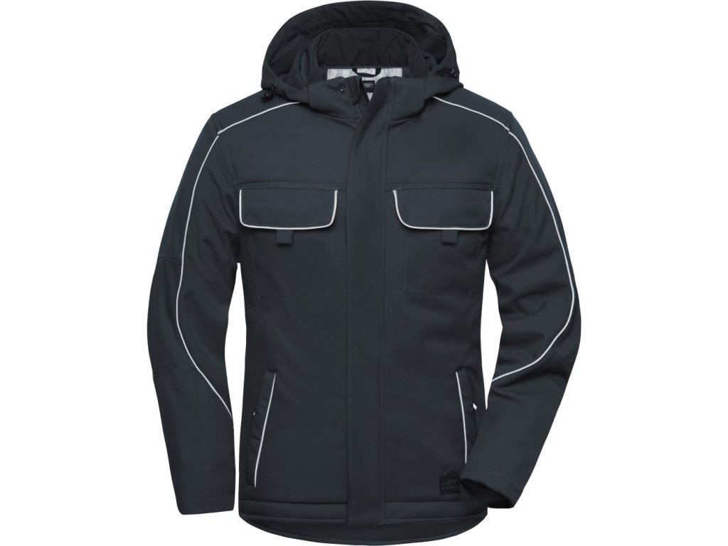 Odolná voči vetru a vode (2 000 mm vodný stĺpec), priedušná a paropriepustná (2 000 g/m² za 24 hodín), stojačik s mäkkou flísovou vnútornou stranou, odnímateľná nastaviteľná kapucňa, ergonomicky tvarované rukávy, vnútorné manžety, podšitý zips po celej dĺžke s ochranou proti vetru a brade, zipsy YKK, skryté gombíky a zipsy, bočné vrecká a vnútorné vrecko na zips, náprsné vrecko s voľným vreckom na jednoduché vyšívanie, rôzne vnútorné vrecká, predĺžený zadný strih, prístup pre ozdoby vzadu, pevný a odolný softshellový materiál, reflexné prvky (bez ochrannej funkcie) na vreckách, rukávoch, ramenách a chrbte, pranie na 30°, nežehliť, nevhodné na sušenie v sušičke. Veľkosti: XS – S – M – L – XL – XXL – 3XL – 4XL – 5XL – 6XL
